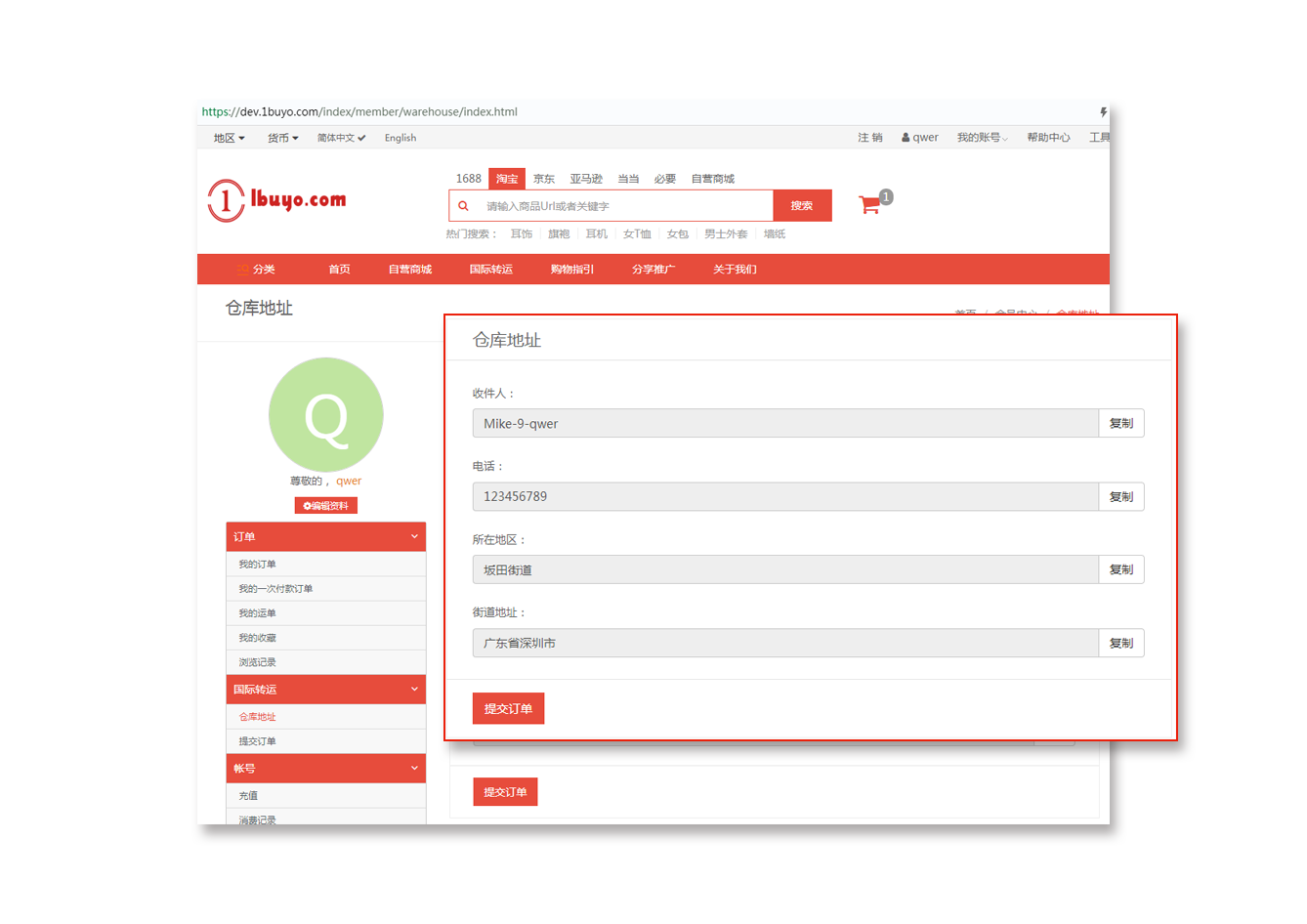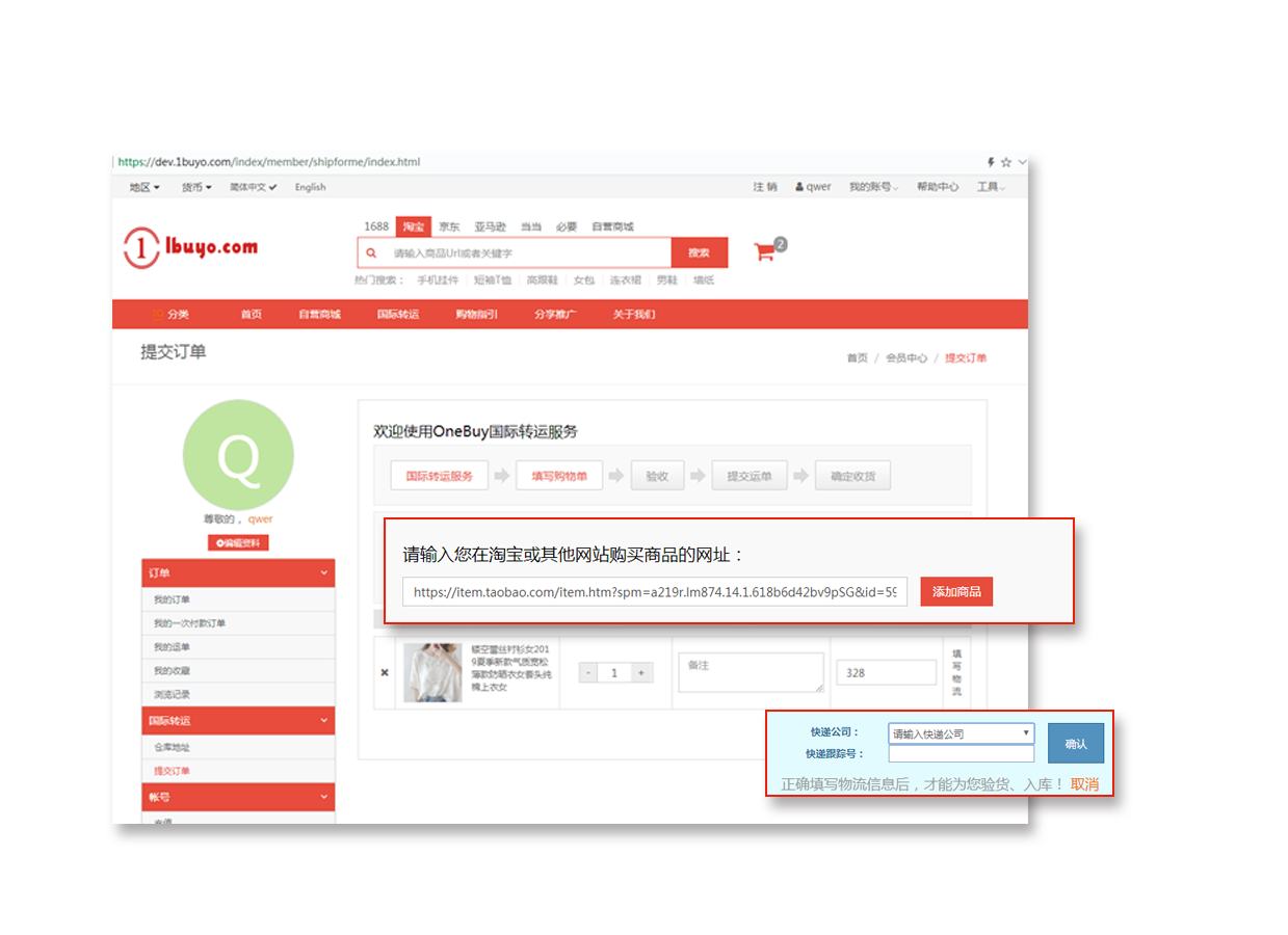 或者通过国际转运填写商品信息直接提交订单到OneBuy平台会;员登陆后在 ‘会员中心’ → ‘国际转运’ → ‘仓库地址’中获取转运地址(此地址信息为您在淘宝、京东等电商平台下单时填写的收件地址信息)然后提交订单点提交后在OneBuy平台填写您购买的商品信息后提交即可!