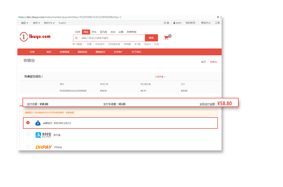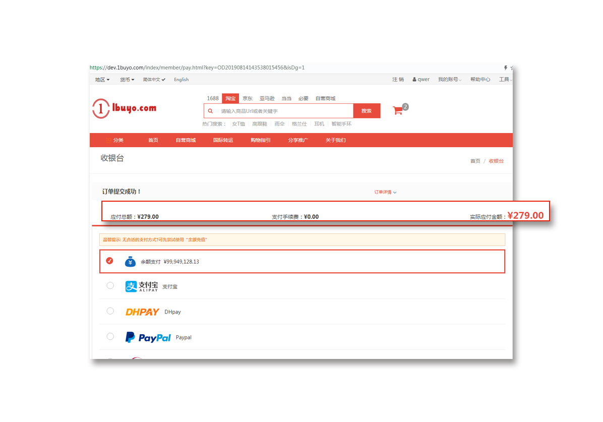 选择购买的商品支付商品费用