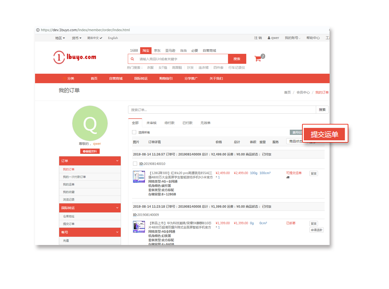 在我的订单中选择已经到库的包裹提交运单寄往国外,或者等待所有要寄送的包裹全部到库后统一提交运单